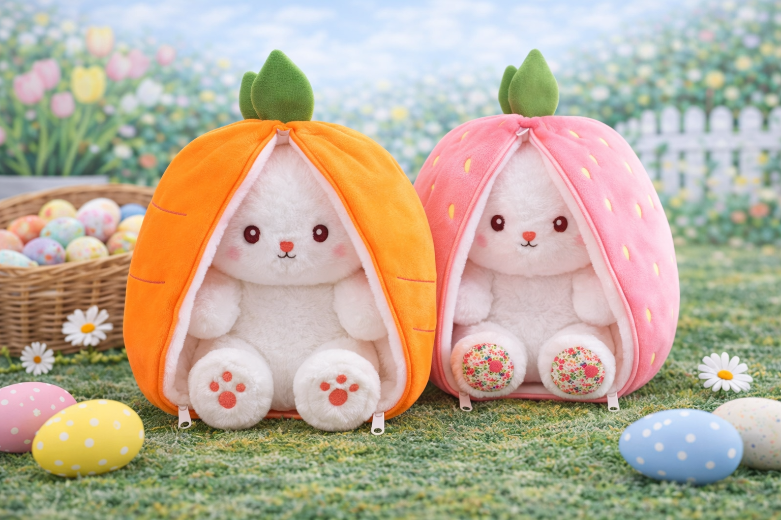 Each bunny cleverly zips up and hides inside its fruit cover (carrot or strawberry). When unzipped, the cover transforms into the bunny’s oversized floppy ears — making them extra fun, interactive, and irresistibly cute - a perfect canvas for customization