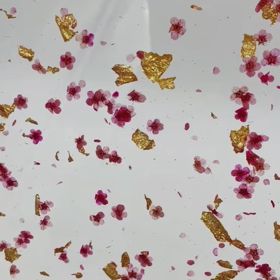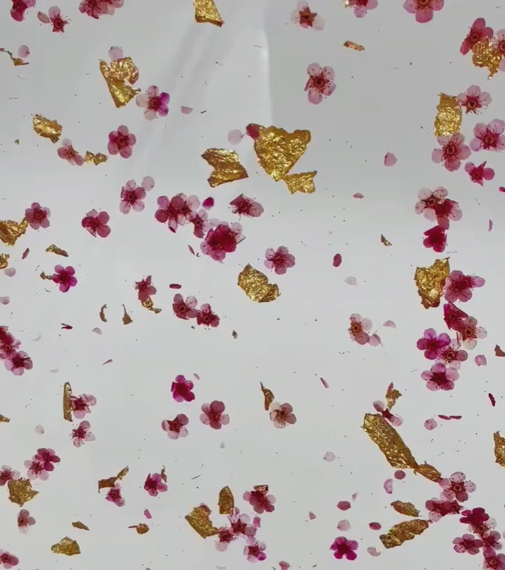 | Colour: | Gold foil and real fuchsia pink mini dried flowers |